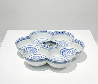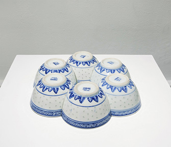 Six Bowls Six Mouths, Hand Carved China, Adhesive, 2012. Image Courtesy of the artist.